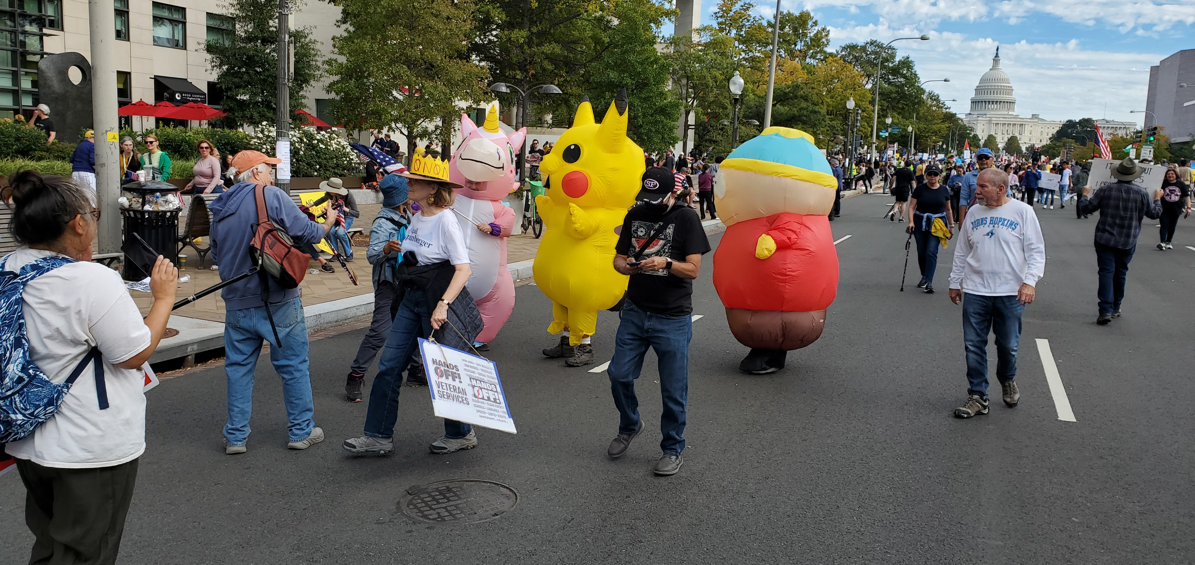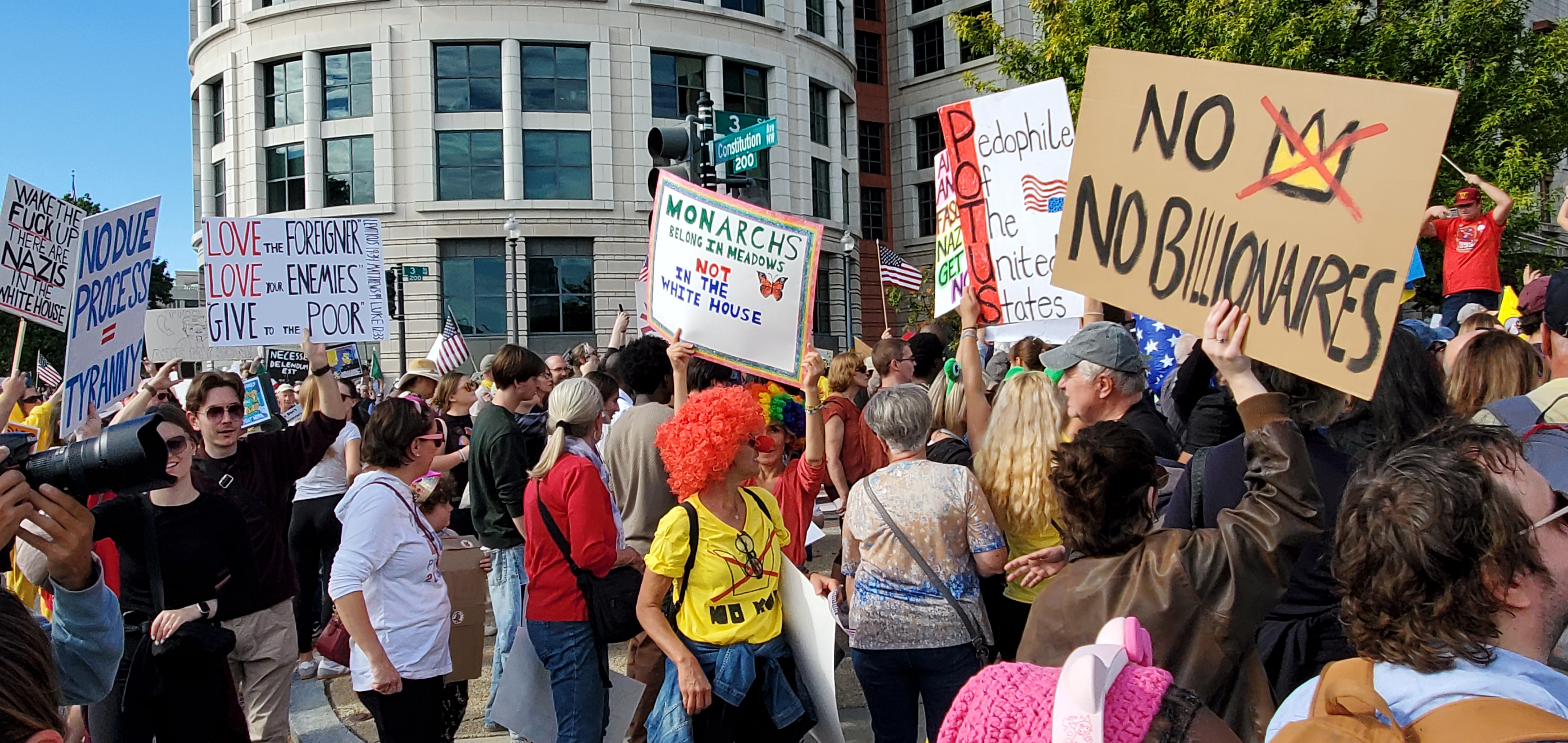 Being on Pennsylvania Avenue with the U.S. Capital in the background, in a massive crowd of people concerned with the growing authoritarianism of the Trump administration, was pretty unique by itself. However, when I began to focus on the commotion around me, I was constantly astonished by what I saw: many clever signs; one-of-a-kind costumes representing animals, Donald Trump, the Statute of Liberty in chains, and other things; numerous children in attendance, including some in baby carriages; and a protestor walking on stilts! Even when the official event was over, a dance party started not far from the main stage, which my wife and I happily participated in. This No Kings event in Washington, DC was one of the most unique protests that Climate First! has ever been to.